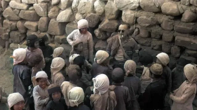 这个场面叫新鲜,孩子们头巾绑得紧紧的,眼睛亮亮的,围着那位戴墨镜的叔叔转,伸手去摸他腰间的小包,嘴里叽叽喳喳问个不停,墙缝里的阳光漏下来,照得小脸泛着泥金色。
