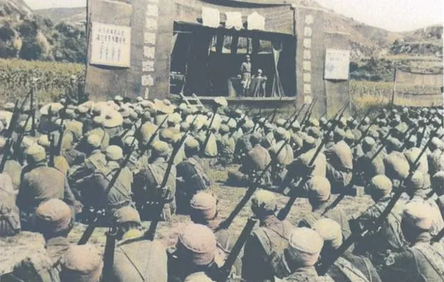 这个台子叫大幕,横幅写得直,木架子扣在地上,士兵们背着长枪蹲成整齐的一片,风把旗角吹得啪啪响,台上人一抬手,底下就像麦浪起伏,整齐却不呆板。