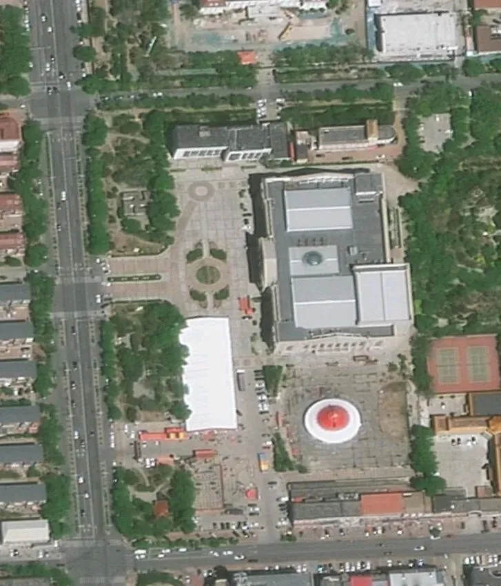 这张照片里左上角的那栋建筑,门厅的样式、三个门柱、玻璃幕墙,都和上面照片里的大港影剧院有点像,可是这张照片我依然看不出是哪个位置,比较明显的可参照的大楼,就是右上角的白色大楼,可现在似乎也没有这个样式的大楼,于是我继续搜寻,看到了左下角卍字形状的游廊,对于这个奇特形状的游廊,我总感觉在哪里见过,刚好下午开车走迎宾街经过大港图书馆,往东一瞥,看到了一个游廊似乎和照片里很像,于是上地图软件查找,结果真的在地图里找到了形状相似的游廊。