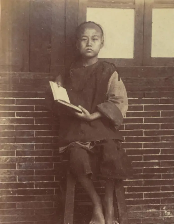 图中这位小子叫学生也行叫学徒也行,瘦瘦的,穿一身宽大的粗布褂子,袖口磨起了毛边,赤脚搭在高脚凳上,手里捏着一本小开本书,纸张发黄,边角被翻得起刺,他眼神直直地看着镜头,像在问又像在忍着笑,背景是整齐的砖墙和木窗,线条一压一压的,衬得人更清,小时候我也这么捧着书装样子,奶奶在旁边敲碗说别只看样子得把字念进去才算数。