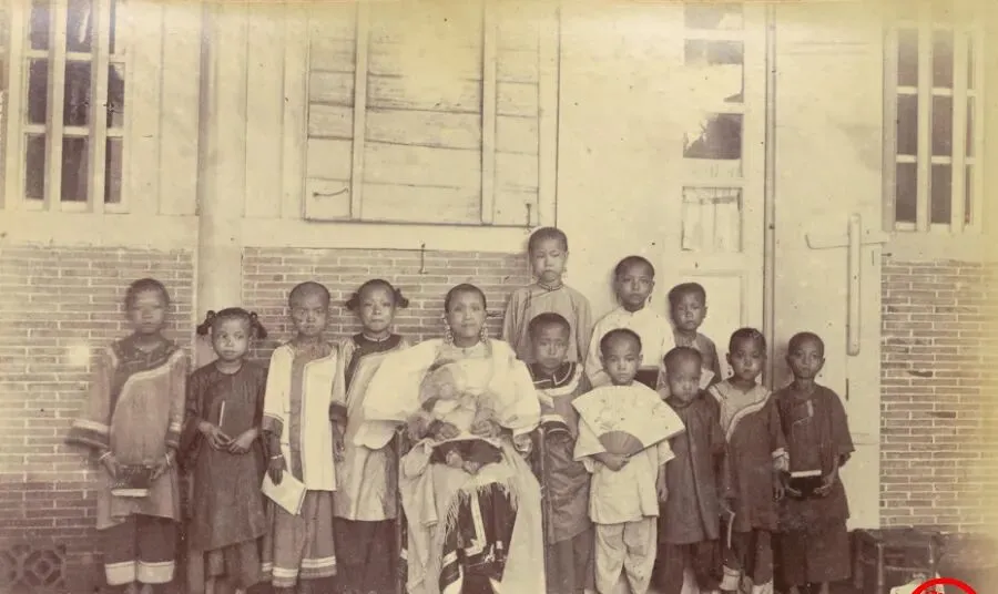 一群小姑娘围着老师站好,刘海被油抹得服帖,衣摆上滚着亮线,手里有的拿扇子有的捏纸本,图中这个地方叫女子学塾或女学堂,也许是刚上完识字课,老师怀里抱着个娃,笑得软软的,想想那会儿家里舍不得放闺女出门读书,若是不收学费更有人愿送,现在大家讨论的是双语班和社团活动,以前能识字就是大进步。