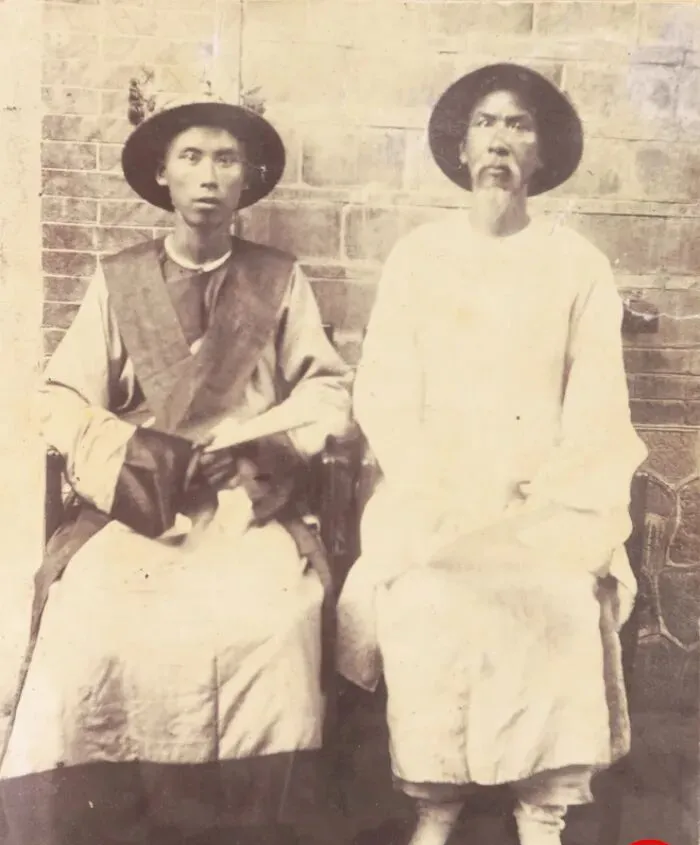 这两位穿着有劲儿,年轻人脚上蹬靴,胸前斜披一片衣料,像是差役的围护,帽檐硬挺,老父亲坐直了身子,镜头一按他眼神一怔,头微微偏过去,图中这身行头就叫差事服,肩背宽,腰间束得紧,为的是干活利落,想起外公常说穿制服时腰板就直,衣服能把人拢住一股劲儿,现在咱图轻快,T恤往身上一套就出门了,那时候穿衣是规矩,也是本分。