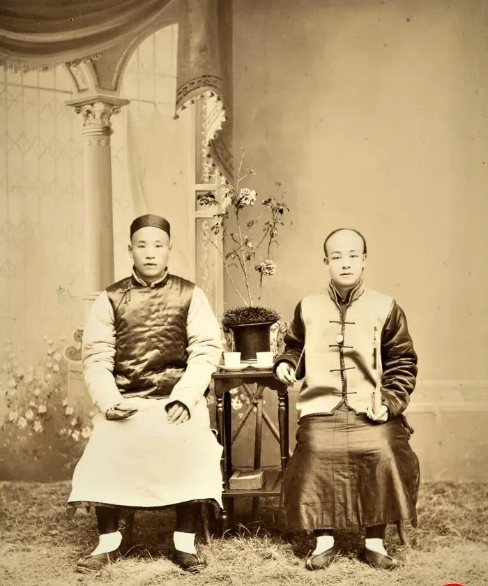 图中这对先生叫影馆合影,背景是欧洲味儿的柱子和帘幔,桌上摆一盆小花,左边这位穿缎面比甲,里面衬浅色长袍,袖口鼓鼓的,右边这位马甲挺括,衣襟扣成一排盘扣,脚上都是白帮鞋,干净利落,坐姿端正,手里还攥着小道具,像是当年的绅士范儿,影馆师傅爱用这种布景,拍出来稳当体面。