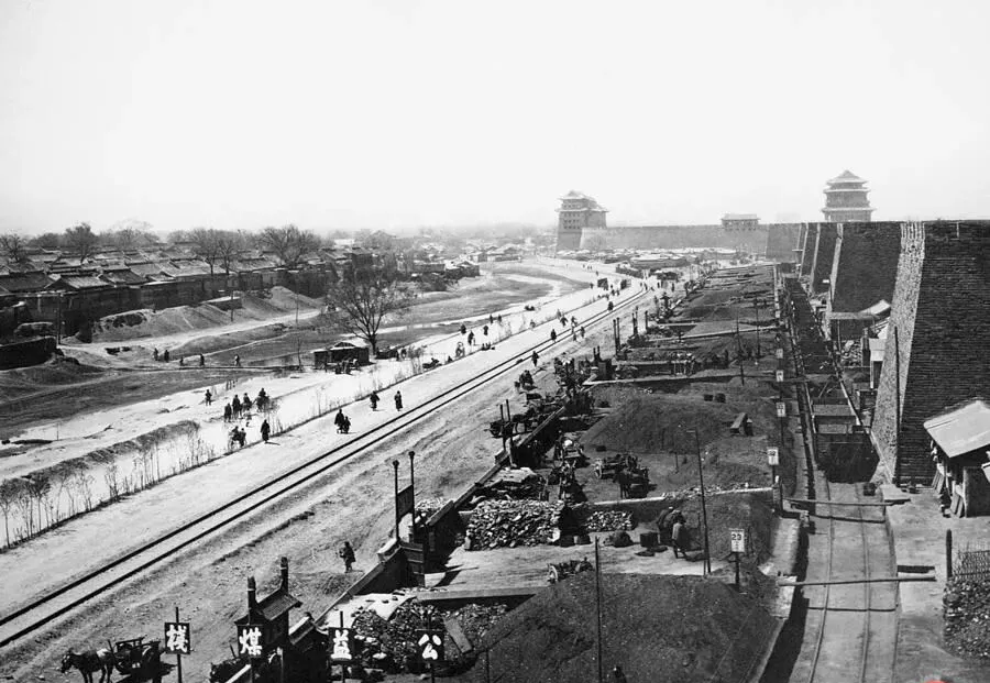 图中这个地方叫前门东车站,站牌上英文字母醒目,站台是碎石地,边上火车车厢漆得发黑,洋兵帽檐高高的,手里比划着啥,远处挤着看热闹的百姓,老妈看了笑,说那会儿去城里坐火车是件稀罕事,得提前一天叮嘱小孩别乱跑,车一进站,汽笛一拉,心口都跟着颤一下。