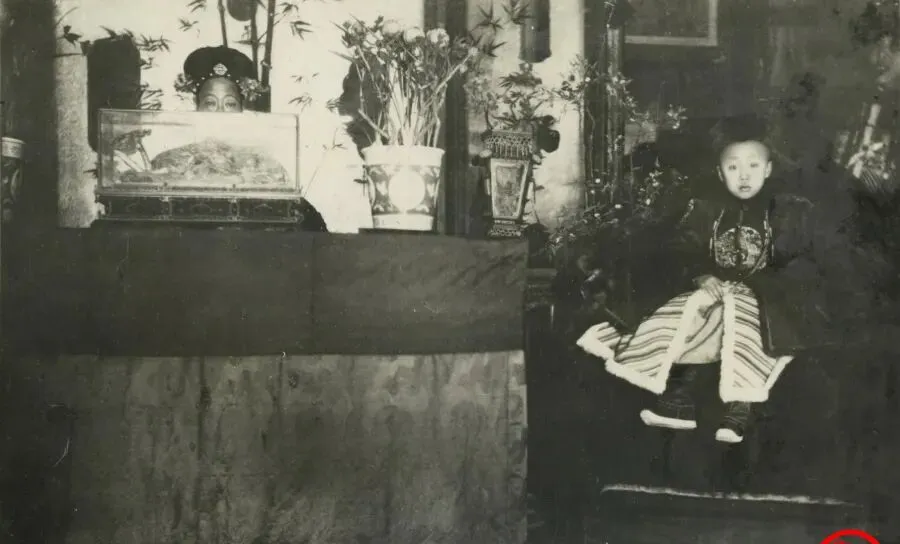 这张照片里的场景叫垂帘听政,帘后只露出半边脸,珠花压得稳稳的,前案上摆着玻璃罩里的摆件,桌布从檐口垂下来遮住半身,旁边的孩子穿补褂团龙,小脚悬空坐在榻沿,史书上写一行字没照片好使,半张脸的分寸,就是规矩,就是权柄的影子。