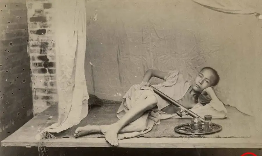 这个细长的家伙叫烟枪,旁边那盏小肚皮的金属壶是烟灯,青年的肋骨一根根顶着皮,席面发硬,手肘撑着腮帮子,像刚从泥里把气喘匀,外头砖墙粗糙得能蹭破皮,妈妈说可别学这个,哪怕穷得只剩一口气,也别往里头灌这种软绵绵的甜毒。