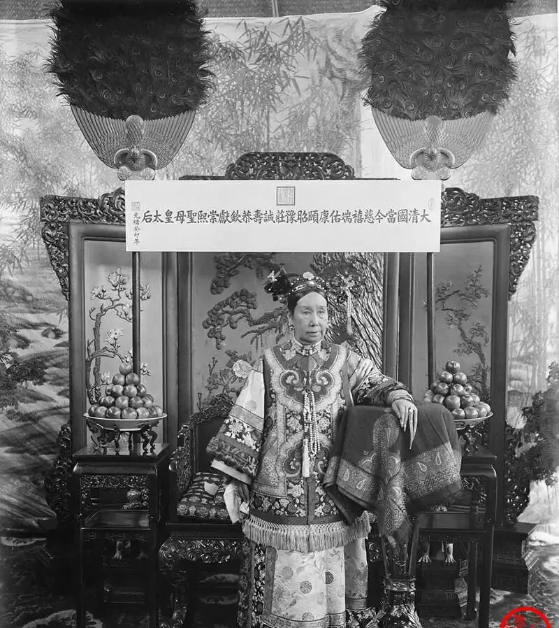 这个华丽的造型就是慈禧太后的站像,衣袍上铺满绣金,团寿、缠枝、海水江崖一层叠一层,袖口流苏挂得整整齐齐,指甲套修得尖尖的,脸色却冷,一句笑都不肯给,她手扶靠垫,背后是大屏风,松鹤、石榴堆得满满当当,屋里东西都在发光,人却像一块阴影。