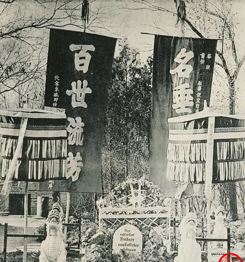 这个立在路口的构架叫克林德牌坊,木柱漆色已经发白,牌匾上写着大字,下面摆着花圈和石兽,风一吹飘带哗啦啦响,场面体面,却透着说不清的拧巴。