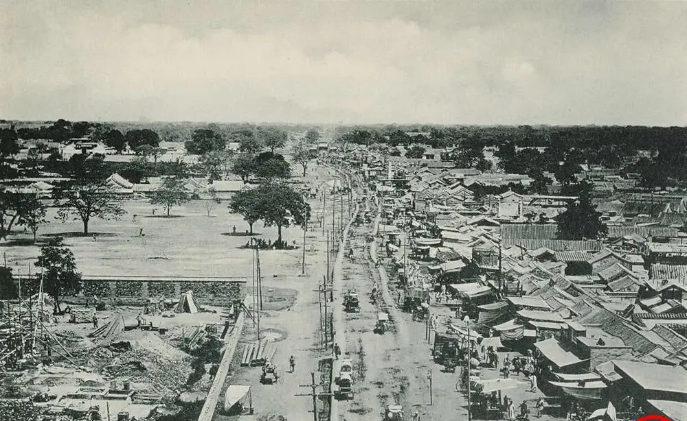 这条笔直的脊梁叫长安街,路正中马车一串串,电线杆像栽秧子一样排着,左边空地像晒麦场,右边棚铺连着棚铺,远远看去一片灰白,热闹声却几乎能从纸上蹦出来。