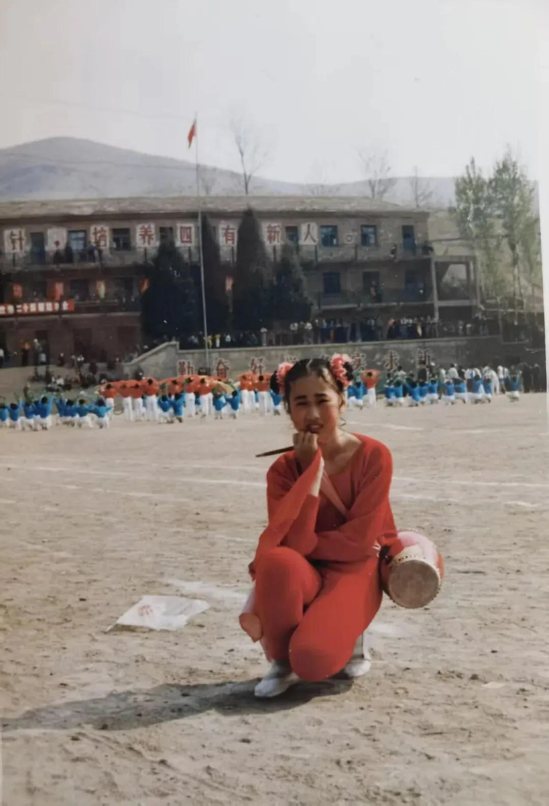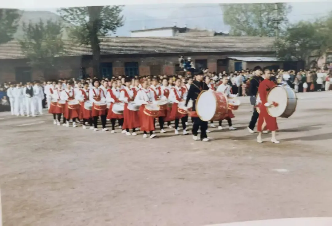 这是一张记录绥中某运动会锣鼓队与花鼓表演的照片。画面中,后方二层楼的墙壁上清晰可见“培养四有新人”等标语。经查,“四有新人”这一提法始于1985年,由此推断,照片很可能拍摄于上世纪80年代。