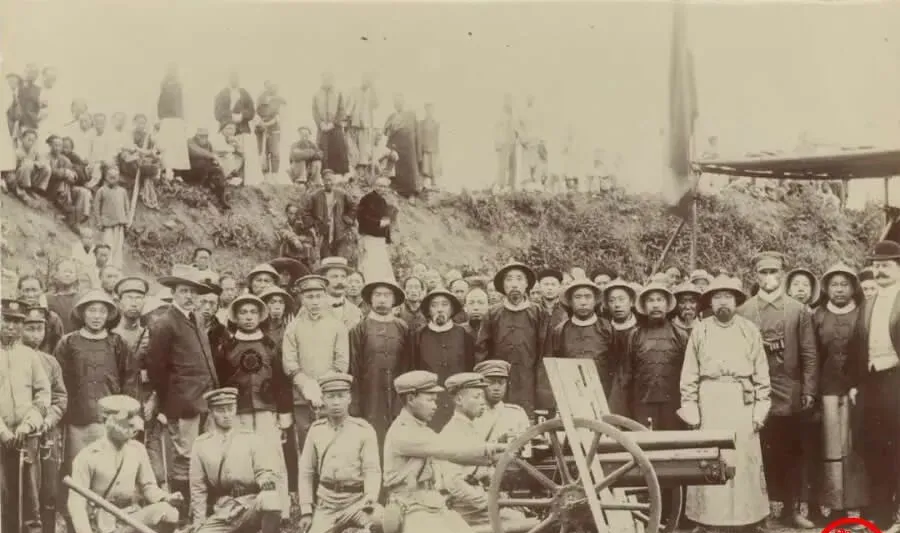 图中这门带木轮的炮叫野战炮,铁质炮身架在双辐木轮上,前面有厚木护板,后面蹲着操炮的兵丁,肩上背着皮带弹包,脸上全是新鲜劲儿,旁边站了一圈观摩的人,帽檐压得低低的,神情又紧又直,场地像是在土坡下,旗杆立在一边,风一刮旗影就抖出沙沙声。