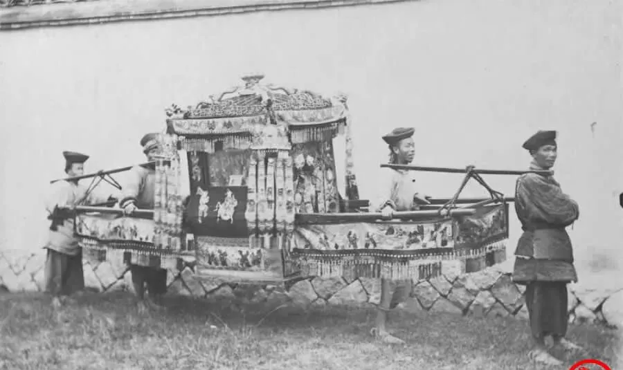 这个彩绣盒子叫大花轿,顶上攒尖儿挂穗子,四角垂流苏,轿帘上绣戏文人物,轿杠粗得能抱不过来,四个轿夫肩上垫着帆布,站成一溜儿,若换成彩色照片准是大红铺底,新娘坐进去心口直跳,唢呐一响,邻里门口的孩童都跟着起哄,奶奶说那会儿娶亲最讲究的不是鞭炮,是轿子晃得稳不稳。