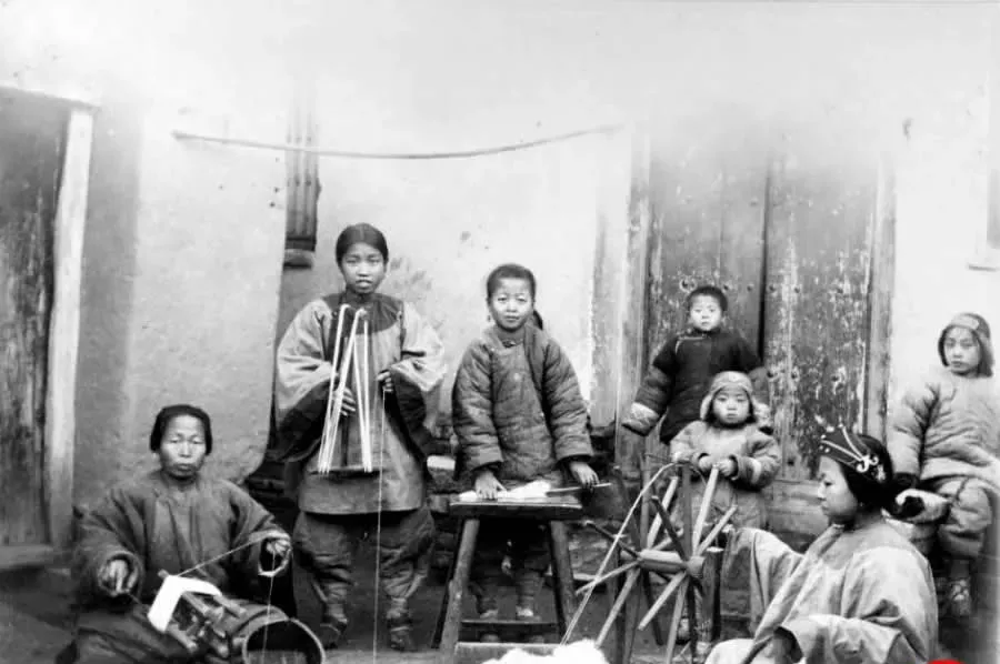 这个木轮子叫纺车,圆轮上一根根木辐,旁边小板凳上放绞好的棉条,左边的女人拈线拉捻,右边的小姑娘摇轮,动作一快一慢正好对上节拍,屋门板斑驳,土墙里透着凉气,小时候我见过邻居婶子也这样干活,脚边一筐线团滚来滚去,猫一扑就叼走半团,逗得大人又气又笑。
