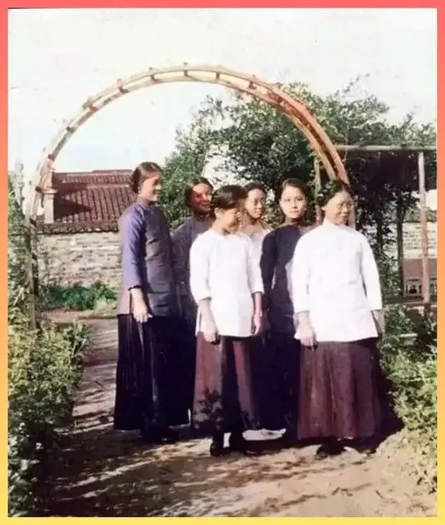 那时候的校园环境也是真的好,.这.种拱门花园,放在现在也是网红打卡.地。但这.群姑.娘站在那儿,你感觉不到一丝浮躁.。她们的笑容是含蓄的,.眼神是清澈的,那种大家闺秀的从容,.是富足的家庭和高等教育共同滋养出来的.。