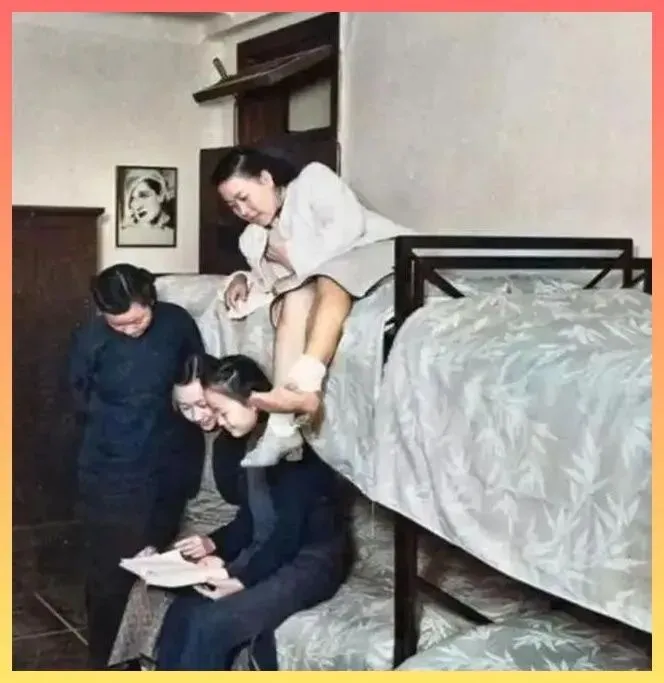 再.来看看她们的日常.生.活。这张.照片特.别有意.思,应该是在分发信件。在那个车马很慢,书信很远的年代.,收到一.封家书.或者情书,是枯燥住校生活中最期待的事儿。大.家围在一起,看着手里的信封,那种期待和忐忑的.表情,隔着屏幕都能感受到那份纯真的悸动.。