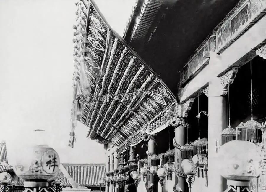 图里铺天盖地的彩棚叫喜棚,竹骨打架,层层叠叠挂满缨络和灯球,檐下全是宫灯,柱身被绸缎缠得亮闪闪,讲究个喜从天降的排场,溥仪成婚当晚的洞房就设在这儿,规矩沿着祖宗旧例走,康熙同治光绪都在这屋圆房,热闹归热闹,转身门一关,依旧是那点天地。