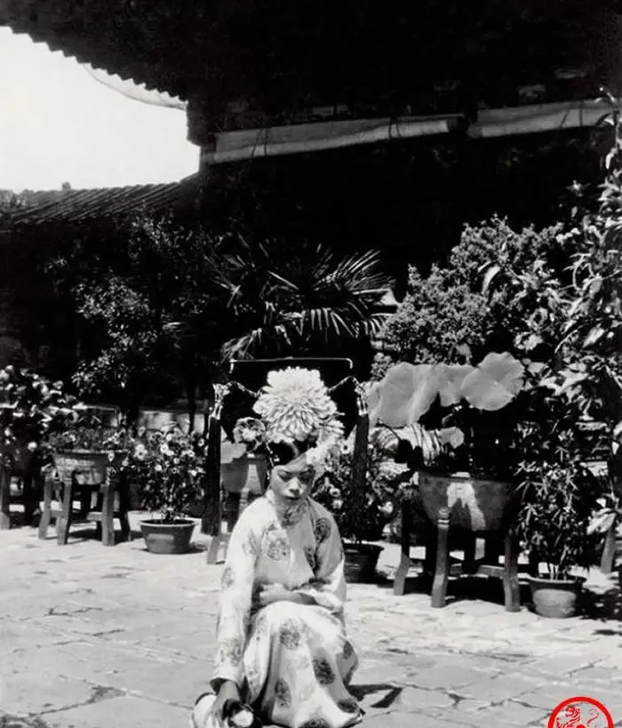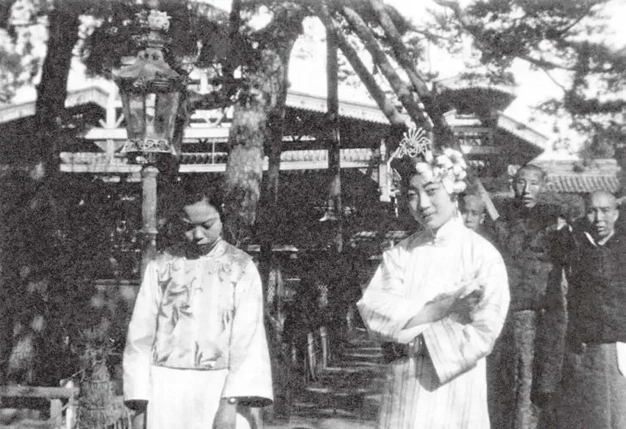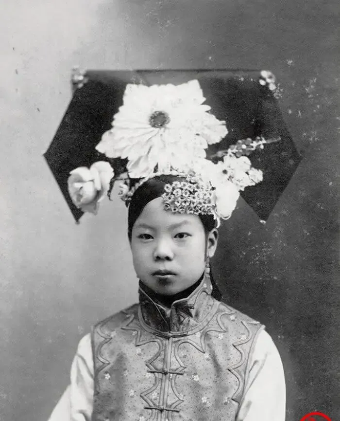 这张端坐的叫定影照,头顶那把大扇似的叫旗头,左右插满绢花,胸前短马甲是绣缎贴金,脸还带着小孩的圆,十四岁的模样,镜头下硬是被摆成了成年人的式样,摄影师喊别眨眼,别动,数到三,咔嚓一下,命运也像被定格在这一下里。