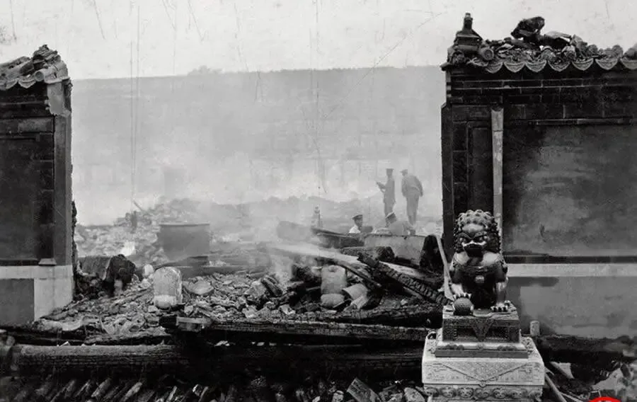 这堆焦黑木梁和碎瓦,就是建福宫大火后的残迹,门墩上的小狮子还蹲着,背后只剩雾气一样的白烟,传说是内监惧罪纵火,珍玩典籍一把烧了个干净,爷爷看这张图只说了一句,好东西怕的不是岁月,是糊涂人,以前东西太多护不住,现在人手一部手机,拍下来留痕,总算不容易被完全抹掉。