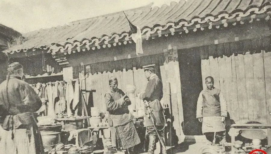 图中这处院落门脸不大,瓦当已旧,檐下挂着锅碗瓢盆的影子,这个摊主穿着粗布坎肩,手里还捏着算盘珠,和一位军官对着话,旁边的小伙计缩在门边,只敢瞄一眼,家里老人说过,那会儿外军走到哪儿,买卖都得让开道,碰上收税盘点的,更得把账本摊开放桌上,谁也不敢多言一句。