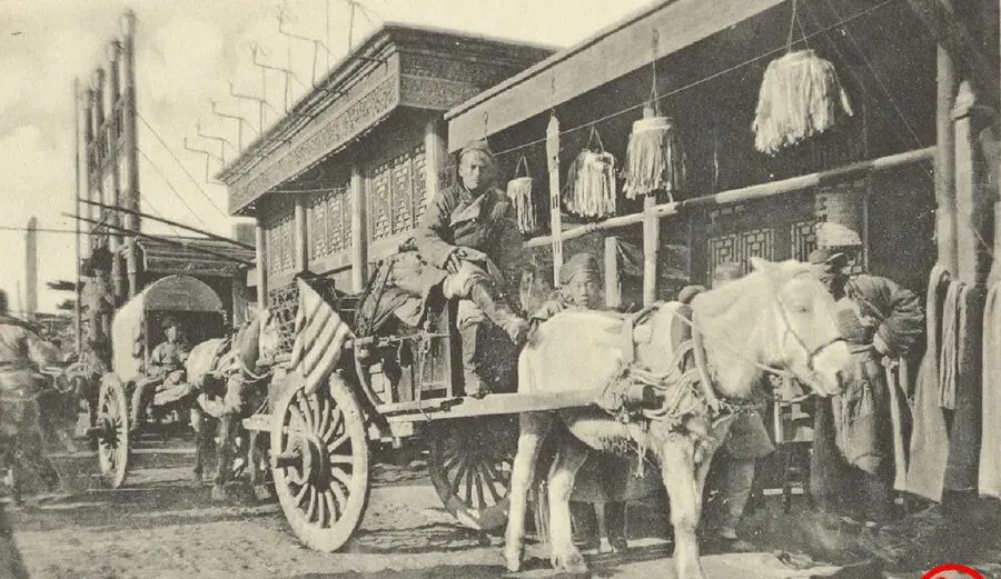 这个长轴大轮叫辘辘车,车辕上扎着一面洋旗,车把式半蹲在板车边上,手里攥着缰绳,车轱辘糙得很,辘辘直响,小时候听爷爷学那声儿,咔啦咔啦的脆,照片里看着热闹,其实心里都虚,旗子是用来保命的,遇到兵丁盘查,好歹能少挨两句喝骂。