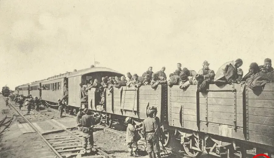 这个敞篷车厢是货车改的,人被塞满,胳膊搭在板帮上,帽檐挤得一条线,车下是兵,肩上扛着步枪,喊两嗓子就把人往里撵,火车是新鲜玩意儿,却先拉走了老百姓,爸爸感叹过一句,以前人推车,现在车推人,能去哪儿不由己。
