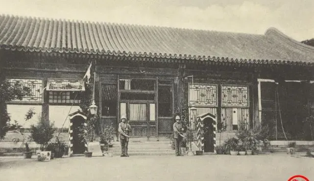 图中这一排房叫仪銮殿,木门沉甸甸,窗棂是回纹,门前树盆一溜摆开,站岗的兵影笔直,这里一度成了联军头目的住处,据说后来失火,殿宇化成一片焦黑,爷爷说木作再好也经不起一把邪火,富贵的壳脆得很。