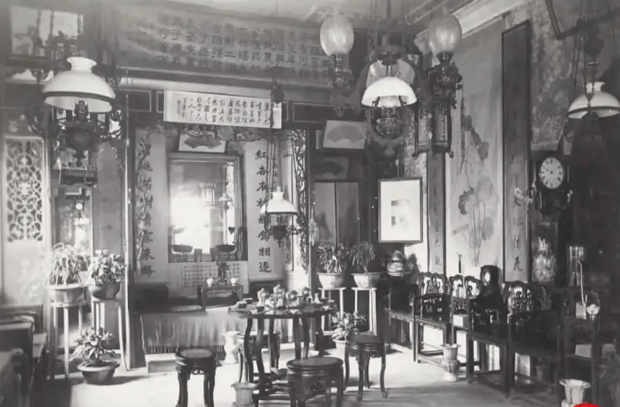 图中这间客厅叫中西合璧的摆设,雕花罗汉床配西洋挂钟,罩着纱的玻璃灯罩从天花上垂下来,重点在那一抹亮,电灯,这玩意儿在当年可不是寻常物,广州点起民用电才几年,能把灯拉进自家堂屋的,非顶尖富户不成,奶奶看老照片时还嘀咕,屋里摆这么满,擦灰都得请个专人呢。