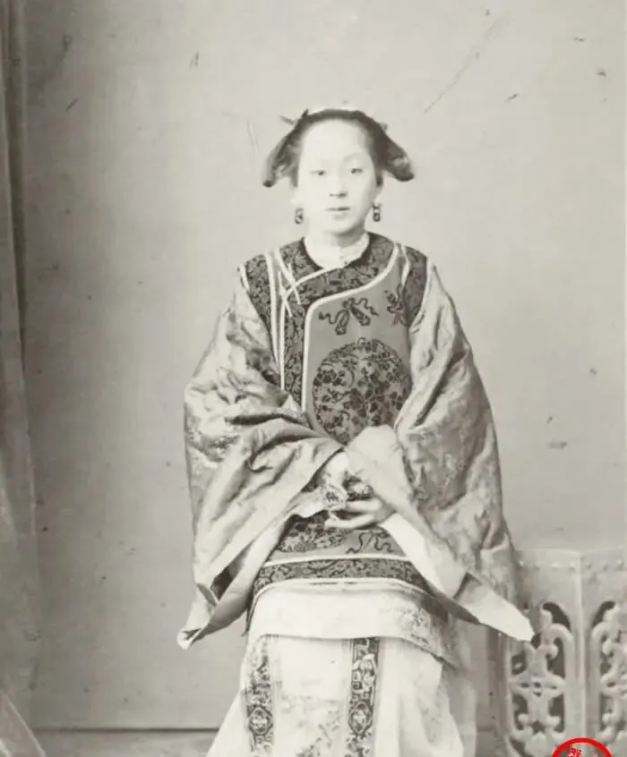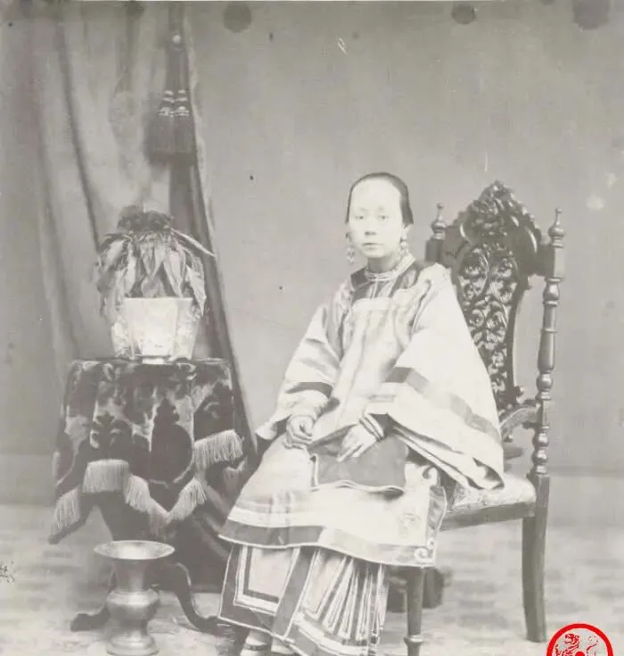 这个坐在雕花椅上的叫袄裙装束,面料厚实,领口滚边三道,垂在腕间的荷包小巧,脚下云头纹鞋尖朝外,姿态一静,耳坠就轻轻晃,奶奶曾说,照相前要把脚尖摆到最合礼的位置,这一摆,三寸金莲的辛苦也就藏进了体面里。