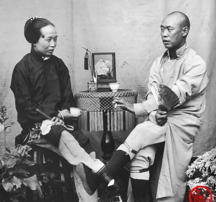 图里这对呢,叫更生活化的合影,小桌放壶与杯,男的手里摇着折扇,指尖一比划仿佛在讲价,女的侧头笑,眼神黏在对面,像家里院子乘凉的夜,风吹过纱帘一抖一抖,老话讲那时夫妻不爱当众示好,可你看,眼神先替话说了。