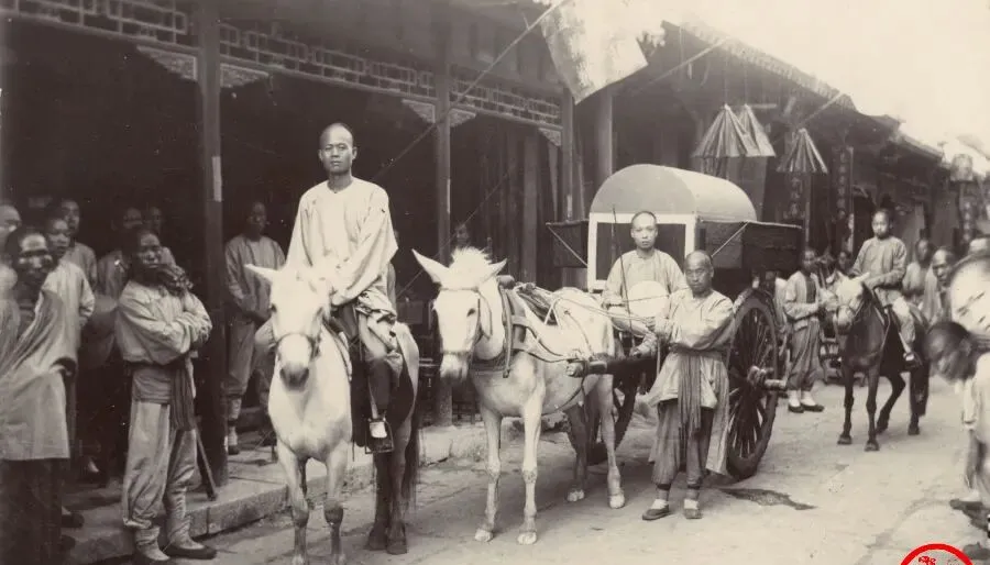 这列队形叫官差出行,前有引马,后有跟马,车上坐的是地方官,车辙压过青石板,扬起一层细灰,围观的掌柜伙计都探着身子看,他手里若握着案卷,说明是公干路过,若只是手搭车窗闲看,多半也是让人知会一声,我们这代人坐过的最多是公交,想到以前赶一程路要换马要等车,就知道时间在那会儿多值钱。