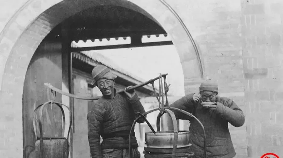 这俩是走街串巷的饭挑,蒸桶一头,汤壶一头,杠子压在肩窝里,人停下就能开张,一勺盛到碗里,客人端着呼噜噜就下肚,风刮脸上像刀,热汤顺喉像火,父亲说以前下工回来,最盼的就是拐角处一声吆喝,来一碗,盐淡些也香。