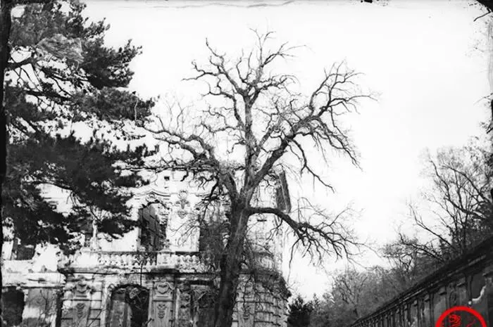 最后这一张,楼体在左边,右侧一棵枯树叉开,像两只手举在空中,树皮皱得像麻布,墙面上的软甲饰还在,花口却被敲掉一块,长廊沿着画面伸过去,越走越窄,越看越空,照片角上那抹红章压着,像故意提醒我们别眨眼。