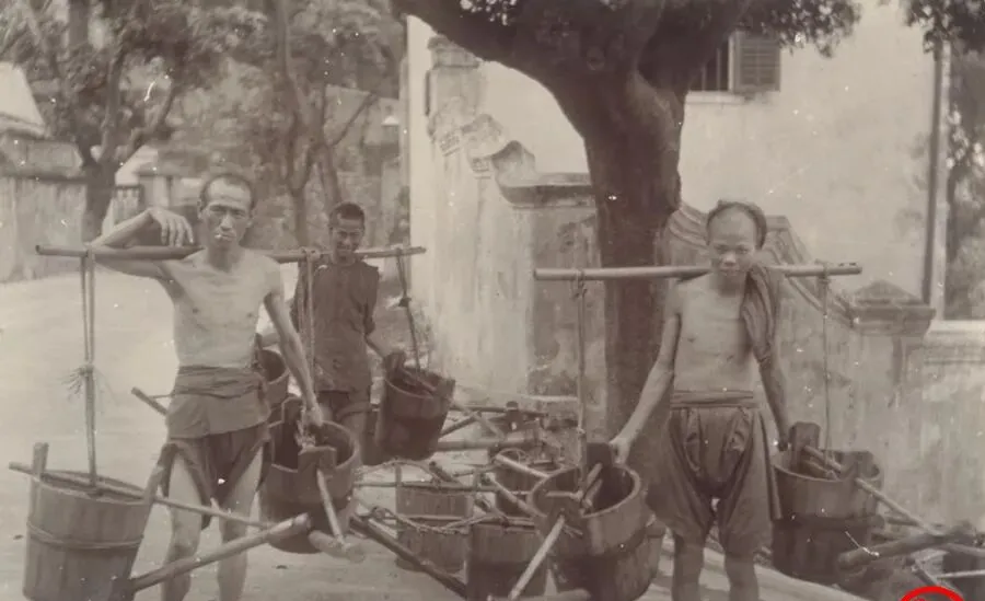 这个肩上的横木叫扁担,前后两只粗木桶摇得当当响,三个人一个比一个瘦,肋条清清楚楚,衣裳像抹布一样挂身上,往城里送水得天没亮就出门,走街串巷吆喝一声,主家拿碗来兑,赚的是几分钱的辛苦钱,现在哪家还挑水呢,自来水龙头一拧就来,以前人把力气当饭吃,现在人把电当饭吃,差得可真不是一点半点。