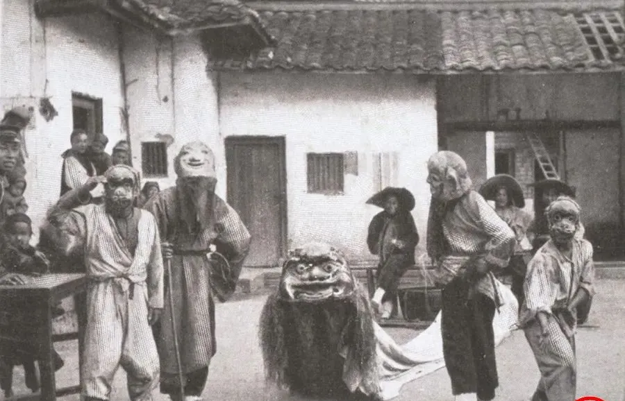 这个咧着大嘴的面具叫大头,木胎上糊纸再刷白粉,后脑勺留个孔给人钻进去,击鼓的人在边上咚咚敲,穿长衫的小子学罗汉走路,姿势滑稽,孩子们笑得嗷嗷直叫,传说戴上它能驱鬼保丰收,城里现在是看舞台剧看电影,以前的年味儿多半靠这种热闹撑起来。