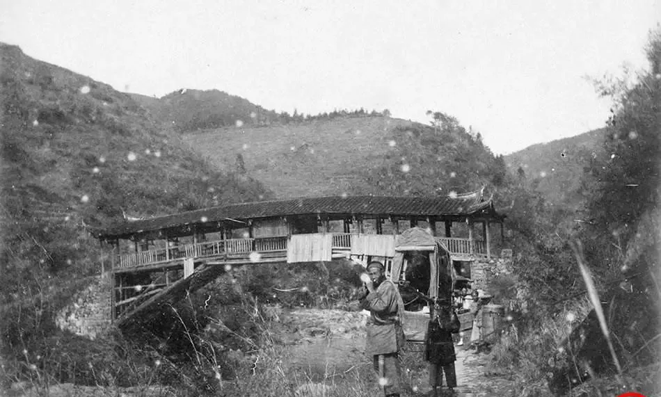 图中这座有屋檐的木桥叫廊桥,桥身用杉木梁一截截搭起来,护栏是竖梢子加横板,走在上面吱呀作响,桥头停着一顶小轿,竹篾打骨,油布罩顶,轿杠亮得发黑,轿夫正歇气抹汗,娘说那会儿下雨天也不怕,廊桥挡风,小轿遮水,人从山那头进镇里看病做买卖,全靠这两样。