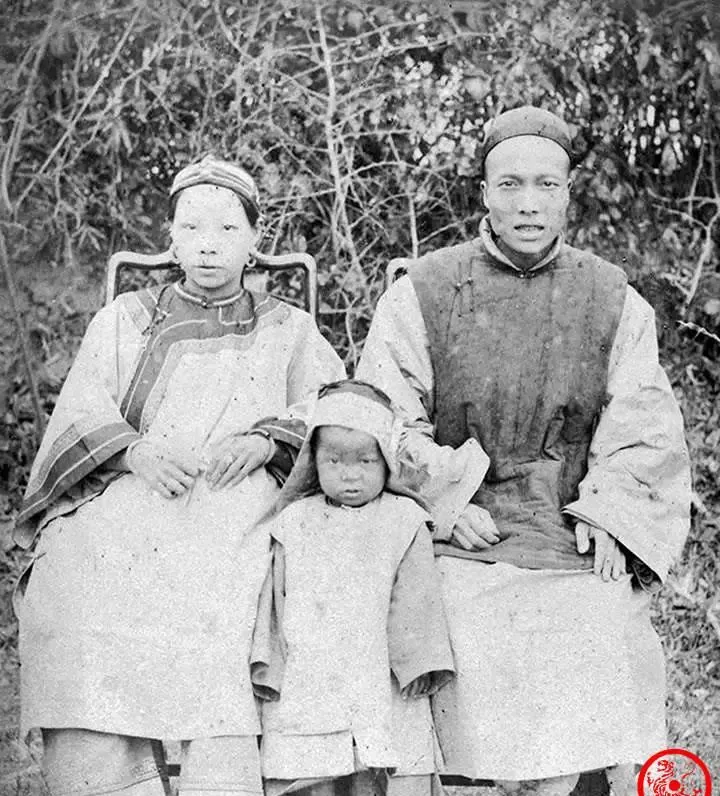 这张坐得板板正正的叫全家福,板凳是细竹靠背,男人戴瓜皮帽,女主人额头束窄头巾,孩子穿对襟小褂,袖子长过手背,表情都有点紧,摄影先生喊别动,数到三再眨眼,妈妈说以前拍照像过年,得把家里最体面的衣服翻出来熨一熨。