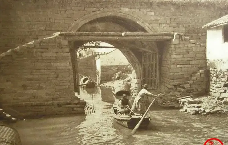 图里的石拱洞就是城墙的水门,青石条一层压一层,拱心里还嵌着一道木闸,水退时敞开,汛期一到就落闸拦水,门洞矮,船篷必须压低,艄公拿篙在桥沿上一点,船身贴着石缝滑过去,咯噔一下,是木篷撞到拱脊的声响,城有陆门也要有水门,江南人家离不开它。