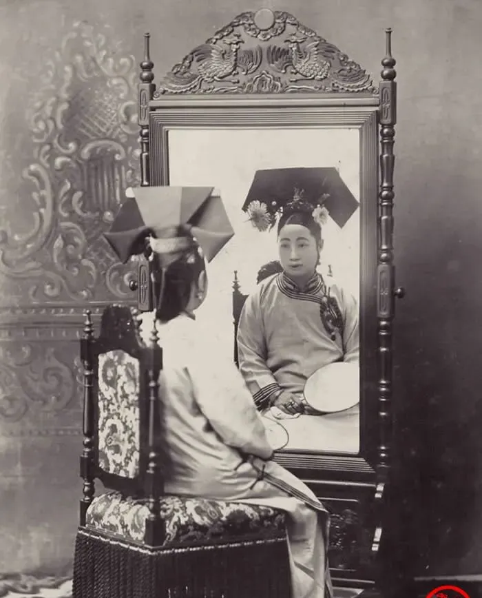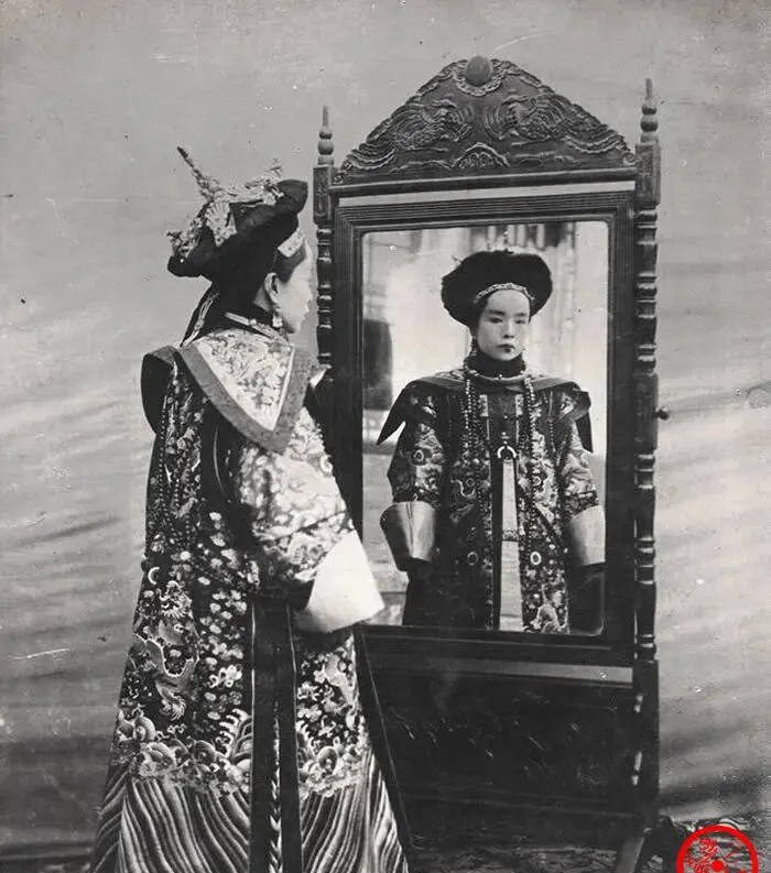 这个大镜子叫穿衣镜,雕了龙凤纹的框,顶上一个圆钮,女主人穿的是蟒袍,纹路密得像海水江崖,袖口里套着里衣,前胸坠满了串珠,镜里镜外两重身影一对看,站姿端着,脸上不带笑,规矩就是规矩,奶奶看见这张说,这样的衣裳沉得很,脖子不硬都撑不住。