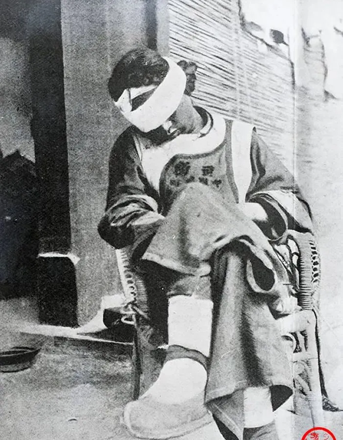 这个布条缠头的叫伤裹,袍前隐约能看见字样,坐在藤椅上,人有点蔫,脚上千层底搭在另一条腿上,袖管里伸出手指在摸什么,像是在理会绷带走向,旁边地上一个小碗,可能是喂水的,时代翻个面,人就被卷到沟里去了,想想心里直凉。