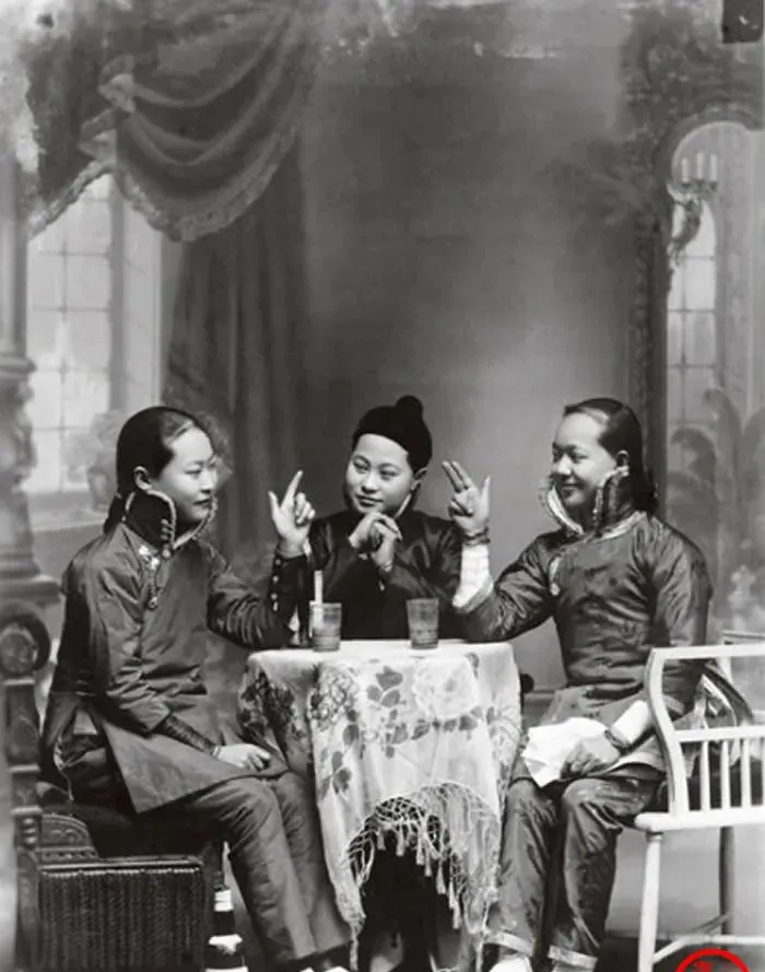 这桌上摆的玻璃杯算洋气物件,三个姑娘指尖一伸一合,嘴角都藏不住笑,后头的帷幕是拍照馆的背景,花边桌布压得平平整整,袖口的滚边亮着光,场面是摆拍没错,可那股欢快劲儿是真,表妹指着说,你看像不像我们聚会玩划拳,我说像极了,只是她们换成了玻璃汽水,我们换成了奶茶啤酒。