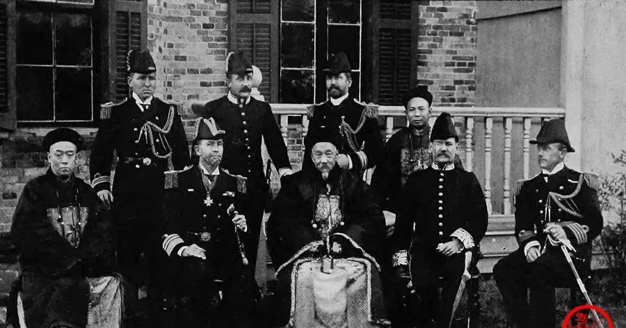 这张西装制服和朝服同框的合影,很有戏,坐中那位总督身披朝珠,左右是洋人军官,后排站得直挺,院子里是砖墙百叶窗,典型的租界风格场景,开铁路、设机器局、买蒸汽船,都要这样一桌桌谈出来,奶奶看过这种照片就笑,说“那会儿中国人跟洋人同坐,不是服不是怕,是要把买卖细细算”,一句话把气口咂出来了。