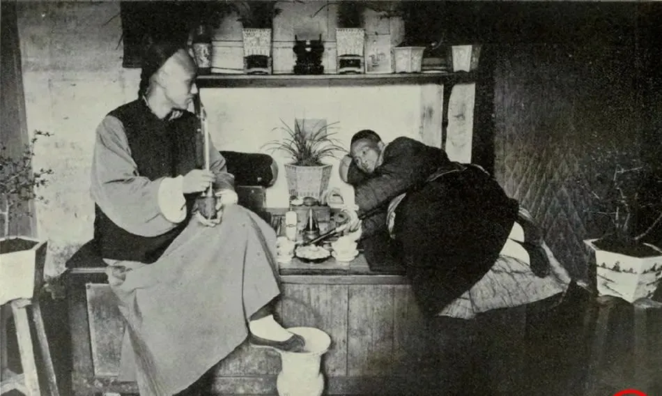 图中这对摆设,一个是水烟杆,一个是鸦片器具,水烟杆细长发亮,铜嘴黑得发乌,另一边的烟具躺了一桌子,火盅、烟枪、荷包都齐了,右边那位半倚着榻,眼神发懒,像是把时光也吸钝了,屋里摆了好几盆景,讲究是讲究,可日子被烟气裹着,也就这样过去了。