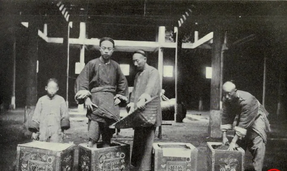 这活儿叫装箱踩茶,木箱外头刷着彩字,里头垫纸,工人卷起裤腿直接站箱里,脚掌一点一点把茶摁实,旁边人抄着铲板往里添,灰尘在梁柱间打旋儿,茶香混着脚汗味,听着不体面,可那时图的是结实耐运,走海路才不至于松散成一箱碎叶子。