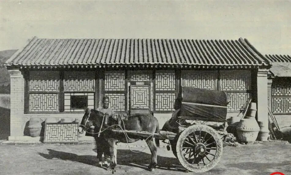 这车叫大轮骡车,木轮上铁箍明晃晃,车棚蒙着黑布,车辕从骡脖子下穿过,主人站在车前握着缰,院墙后一溜影壁窗,砖缝里塞着土渣,想象一下压在石子路上的声音,咯噔咯噔的,慢是慢,稳倒是稳,拉粮拉柴都靠它,和如今一脚电门就起飞的车比,真是两个世界。