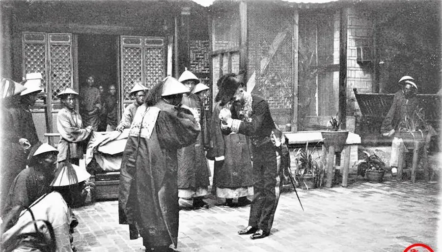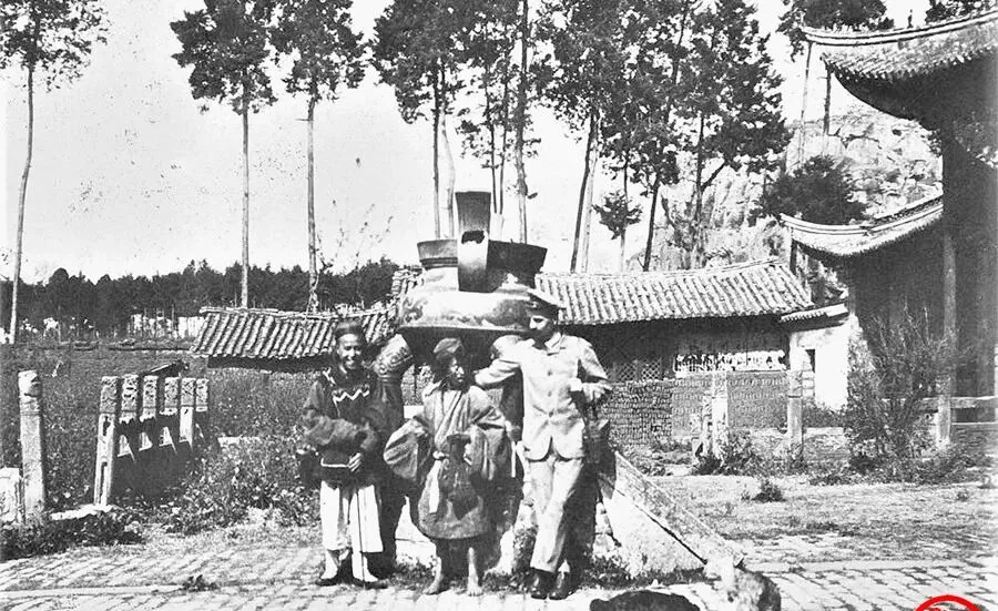 这张合影里站在石缸旁的家伙穿的是呢料西装,身边两个中国人衣襟肥大,脚上草鞋趿拉着,后头是灰瓦脊和高高的白杨树,风一吹,树影斑驳像打在铜镜上的光点,妈妈看了笑,说那会儿照相不容易,能靠着大器物留个影儿,心里就踏实一半。