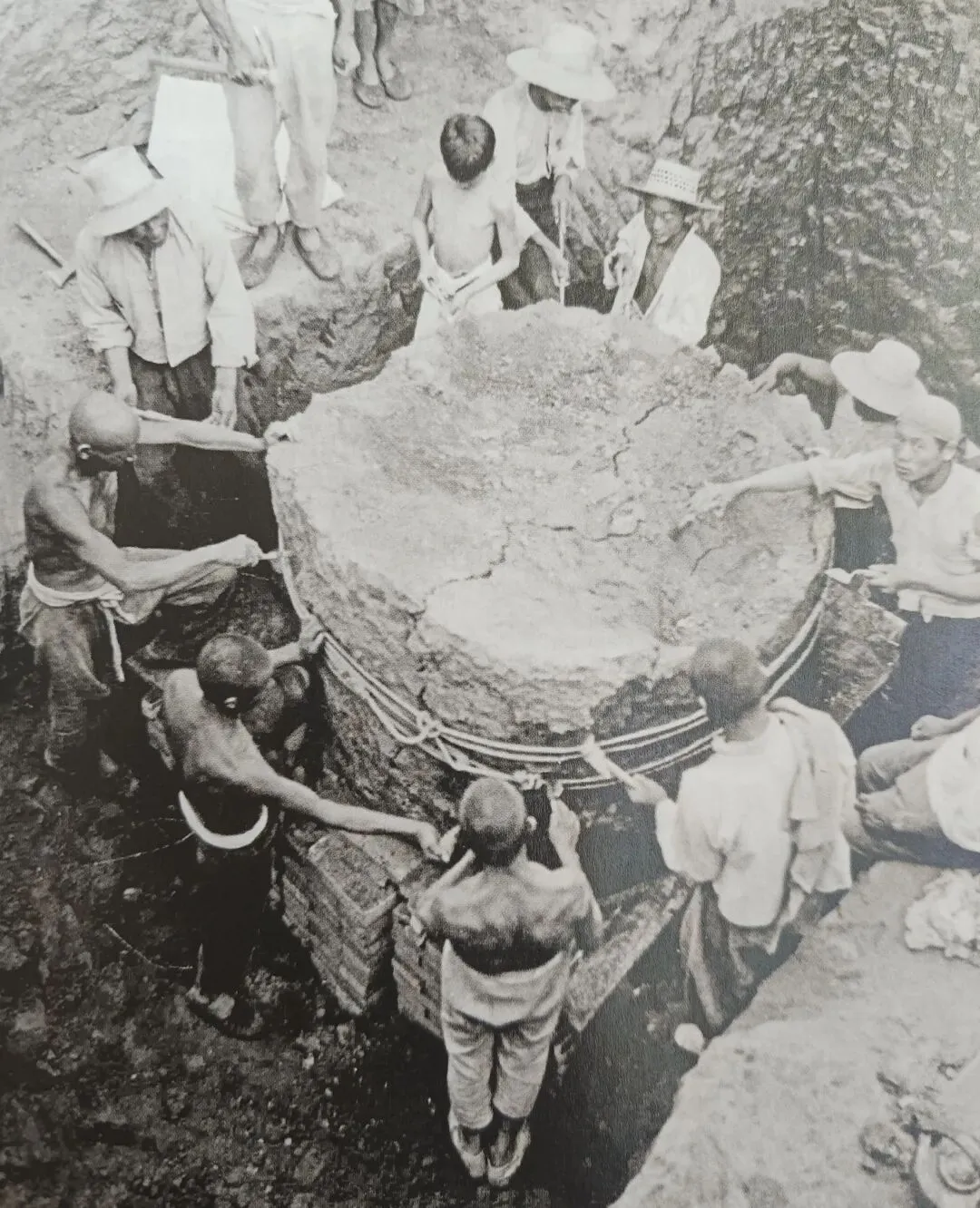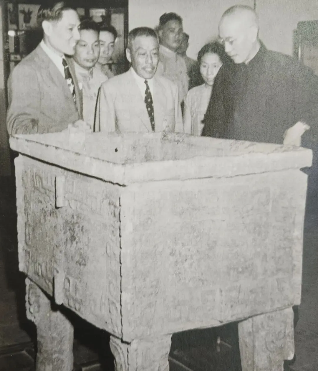 1948年,中央博物馆和故宫博物院联合举办展览,后母戊方鼎首次对公众展出,蒋介石亲临观赏并合影留念,大鼎耳朵还没有焊上。↓