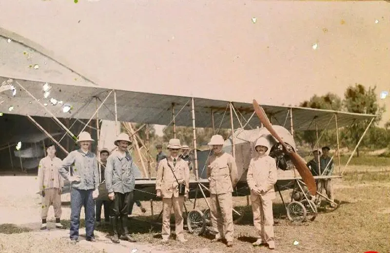 图中的大玩意儿叫双翼机,布蒙机翼、木质机身、前头一副大螺旋桨,地面是细小的轮子,教练们戴着硬草盔站成一排,脸被日头晒得发红,发动机一吼,风刮得人眯起眼来,爷爷说第一次看见这种家伙,心里直打鼓,天上那点儿地方也敢抢,想想那会儿地上还拉着独轮车,天上已经冒出了飞的,时代就这么拧巴着往前走。
