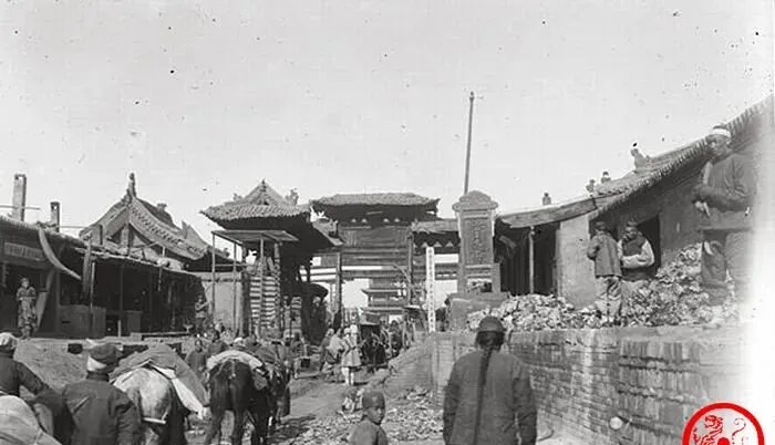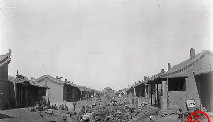 图中这条街叫集市街也好官道也罢,两边歪歪扭扭的房檐压下来,青砖门脸被风沙磨得发白,地上堆了一撮一撮的柴棒子,正中开着窄槽,像谁草草刨了条沟就丢下不管,卖小吃的挑担蹲在沟边,孩童赤脚踩着细土,走两步就能把脚背染成灰色,听得到牲口鼻息喷气的声音,急躁又无奈。