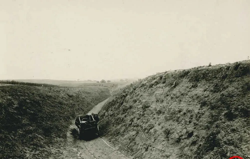这个像被车刀拉过的槽叫土路车辙,深了之后人和车都只能贴着里边走,雨一来就泥泞,晴了风又把尘卷起来,我小时候坐在大车上打盹,一醒就听到轱辘吱呀吱呀,车夫嚷一嗓子,前头的驴抖抖耳朵接着走,路边草籽粘在脚脖子上,回家得一粒粒抠下来。