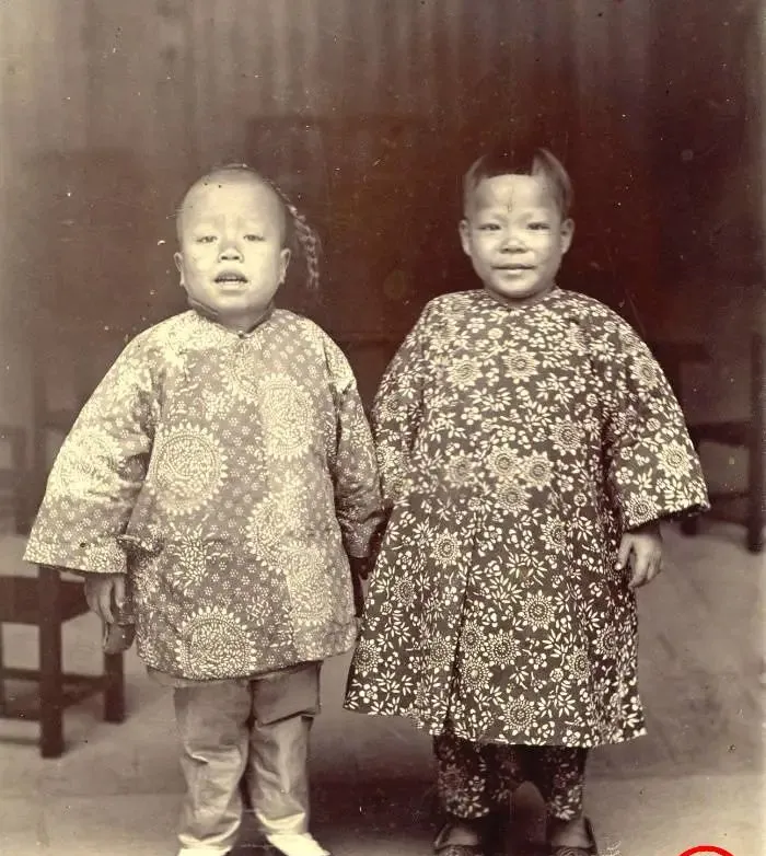图中两个小家伙穿的叫大花袄,粗眼一看花得有点“吵”,细瞧却规整,绸缎面子里衬棉絮,团花纹样一朵摞着一朵,袖口肥肥的,扣子是盘扣,站在屋檐下,脸蛋被风吹得发亮,脚下是绣花鞋加棉护脚,别笑土气啊,当年这身行头可不便宜,能穿出门的,多半家里日子不差。